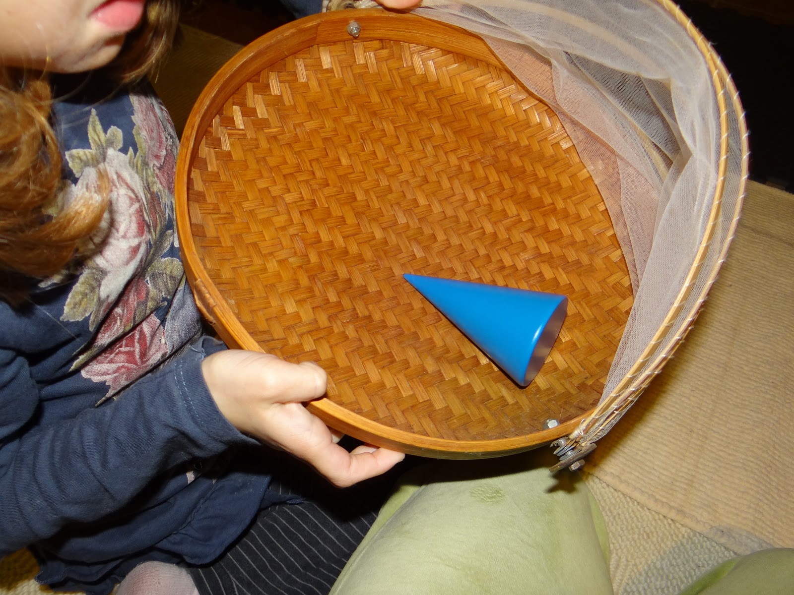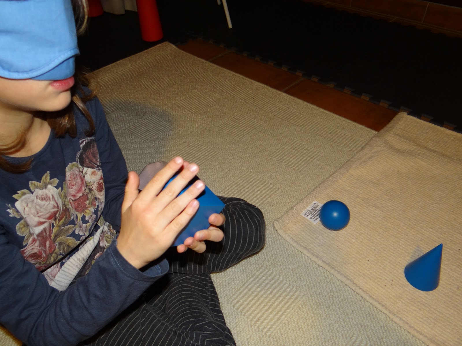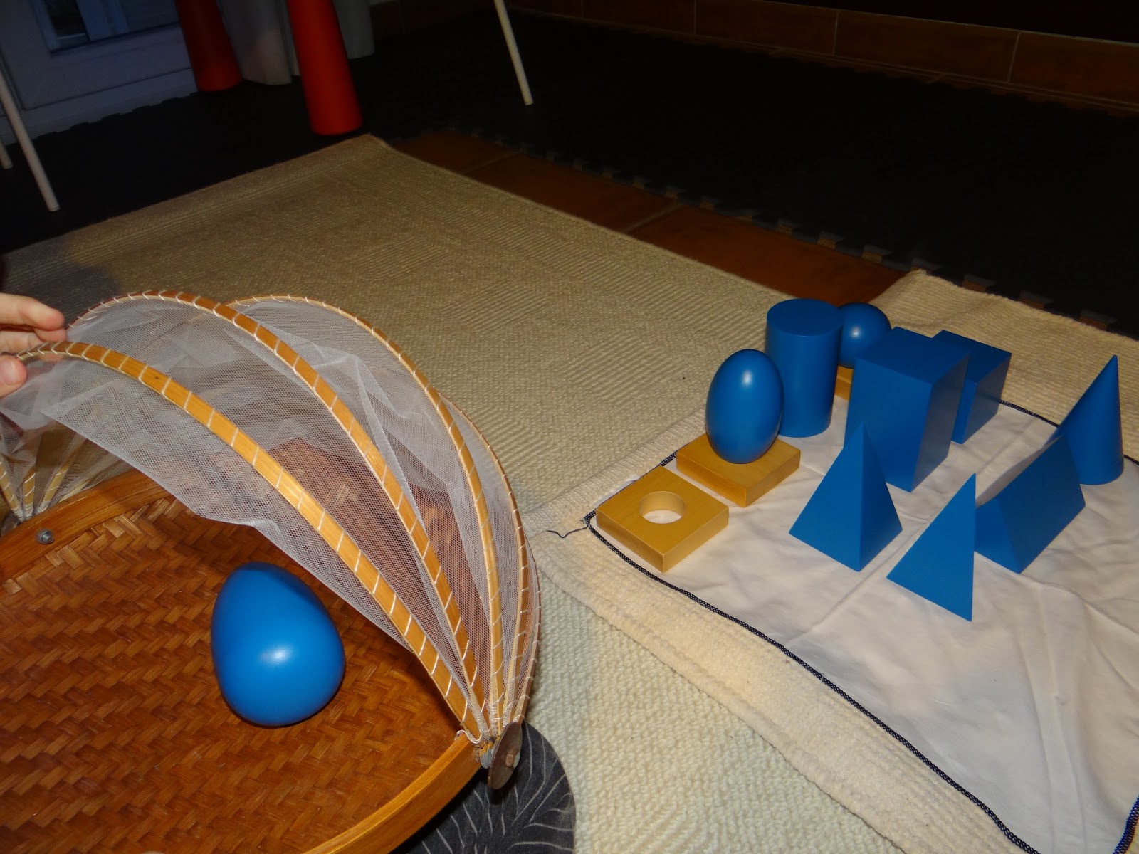 En la primera presentación lo más importante es la parte sensorial, el ver el movimiento que tiene cada sólido, por eso este material está encuadrado en Sensorial. El niño debe tocar los sólidos, debe sentir su forma, sus aristas, y comprobar los que ruedan y los que no. Para eso utilizamos esta cesta, para moverlos y comprobar que hay algunos que ruedan y otros no.