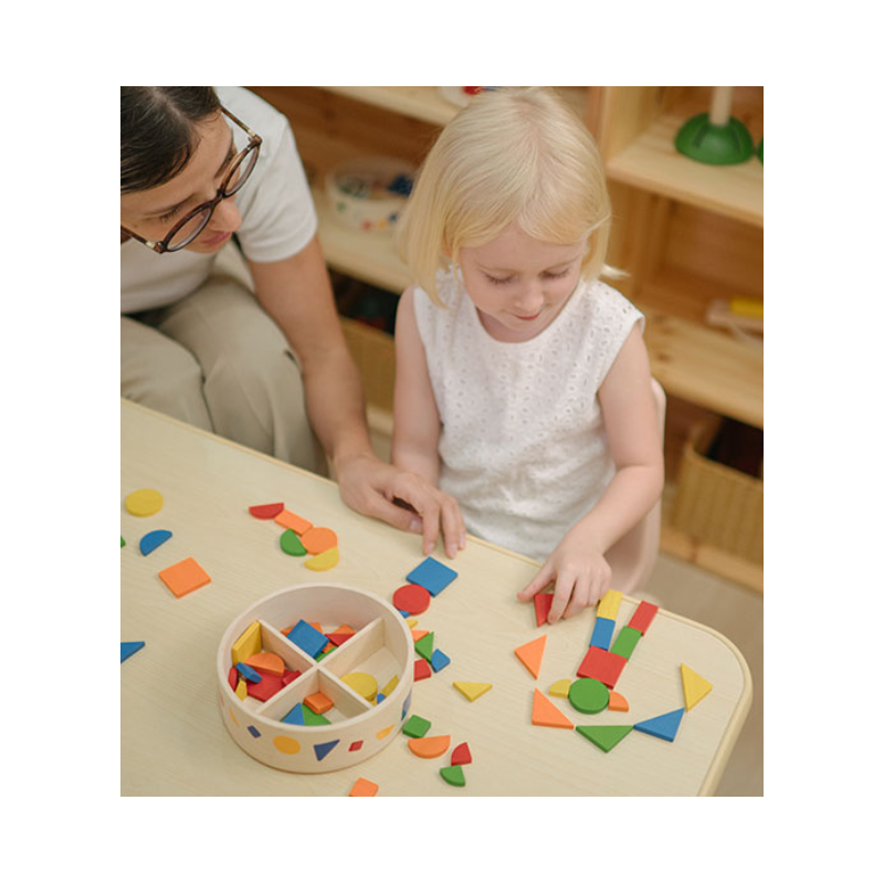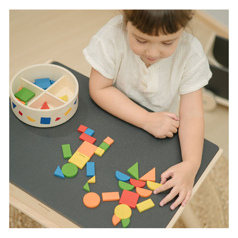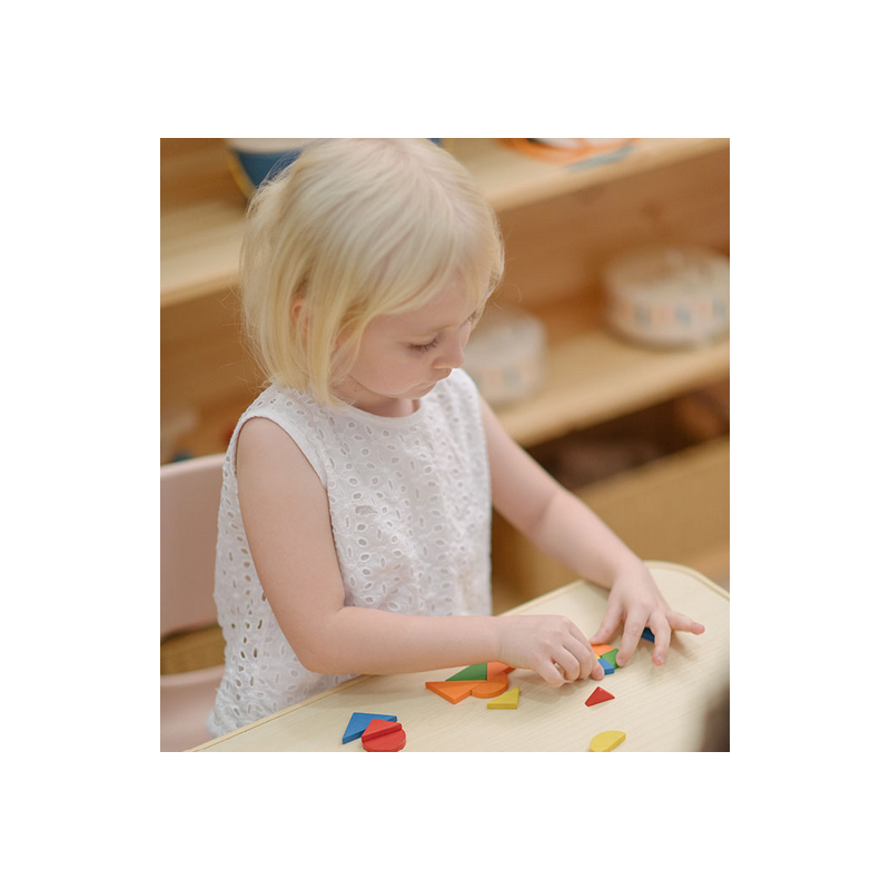 El juego incluye 45 piezas geométricas, distribuidas en cinco colores (rojo, azul, verde, amarillo y naranja), con 9 piezas de cada color, lo que permite crear composiciones equilibradas, trabajar patrones de color y explorar simetrías de manera natural.