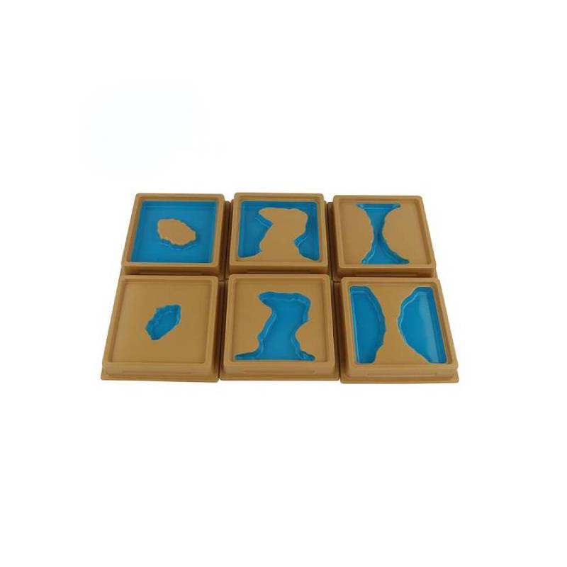Gli incidenti geografici sono presentati in modo sensoriale con questo materiale. Prendere una brocca con acqua e versarla dentro questi vassoi di plastica.