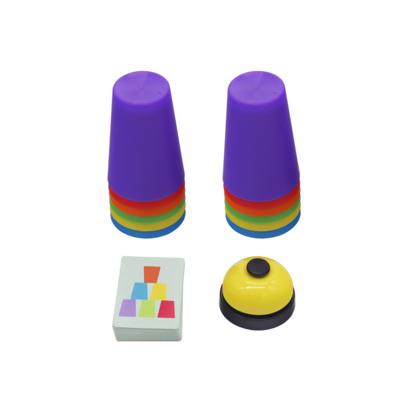 Este juego combina vasos apilables de colores con tarjetas de doble cara que proponen distintos modelos para construir. A los niños les encanta porque mezcla velocidad, precisión y creatividad: deben observar la tarjeta, reproducir la torre y ser los primeros en completarla si están jugando en grupo.